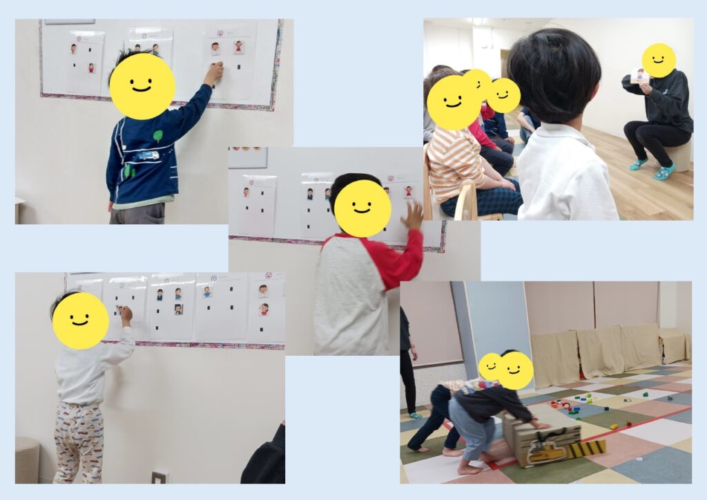 表情を見てどんな気持ちか考える活動では、絵カードの表情がどんな気持ちか考えて仲間分け。お友達が貼る様子も見ながら、みんなで一緒に考えました。